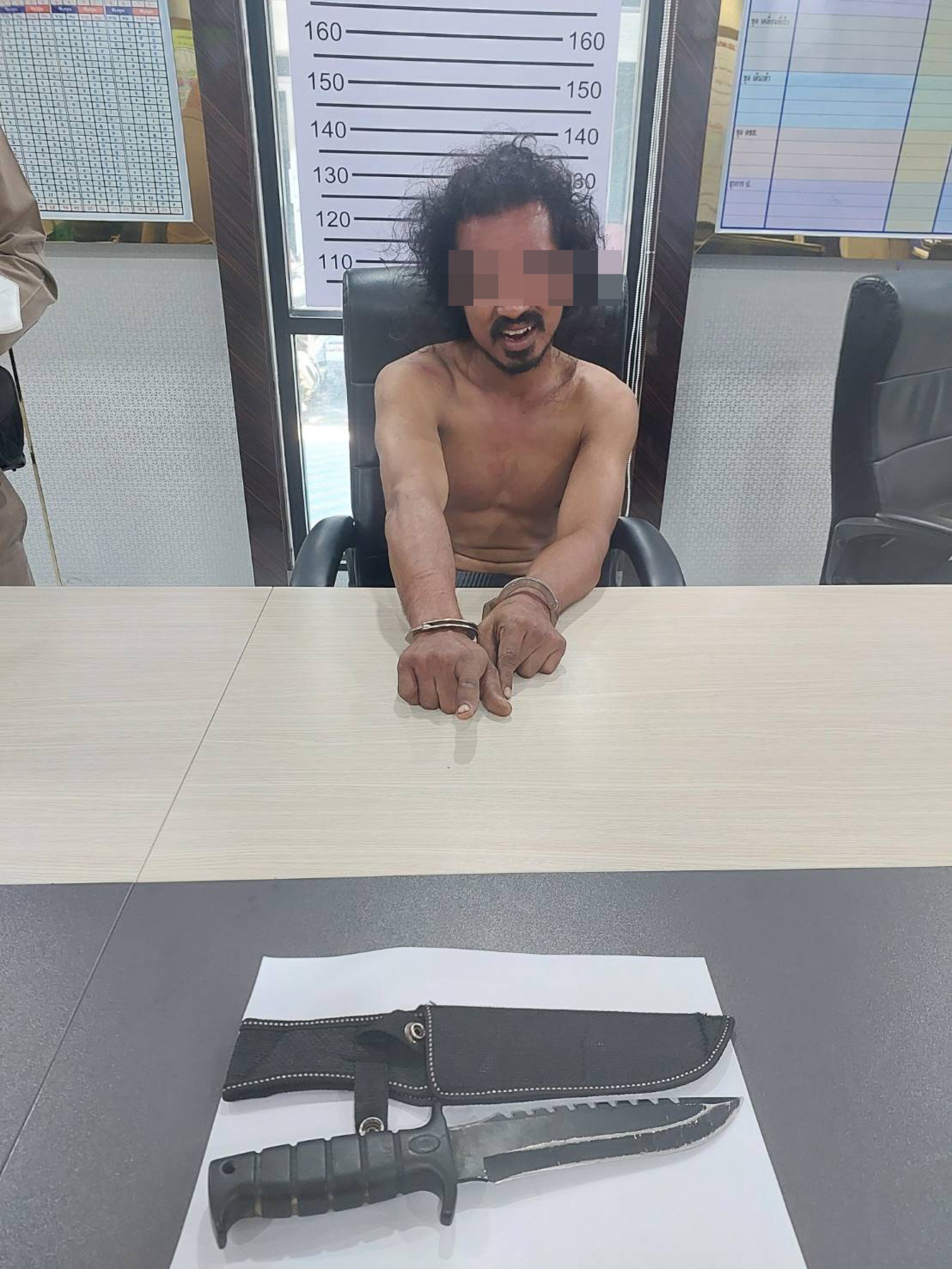 ที่เกิดเหตุพบชาย 1 คน รูปร่างสูง ผิวดำ-แดง สูงประมาณ 167 ซม. ผมยาวนุ่งโสร่ง ไม่สวมเสื้อ ถืออาวุธมีด ทราบชื่อภายหลังนายอิสราแอล อ่อนเล็ก อายุ 33 ปี เดินถือมีดของกลางดังกล่าวอยู่ เอะอะโวยวาย เซไปเซมา เจ้าหน้าที่ตำรวจจึงได้เข้าเจรจาต่อรองในเบื้องต้นแต่ไม่เป็นผล