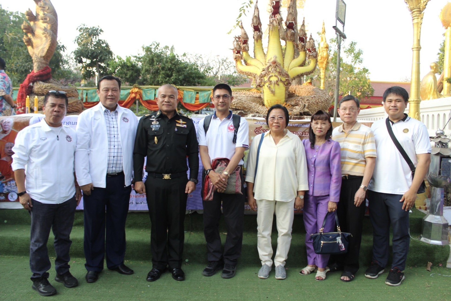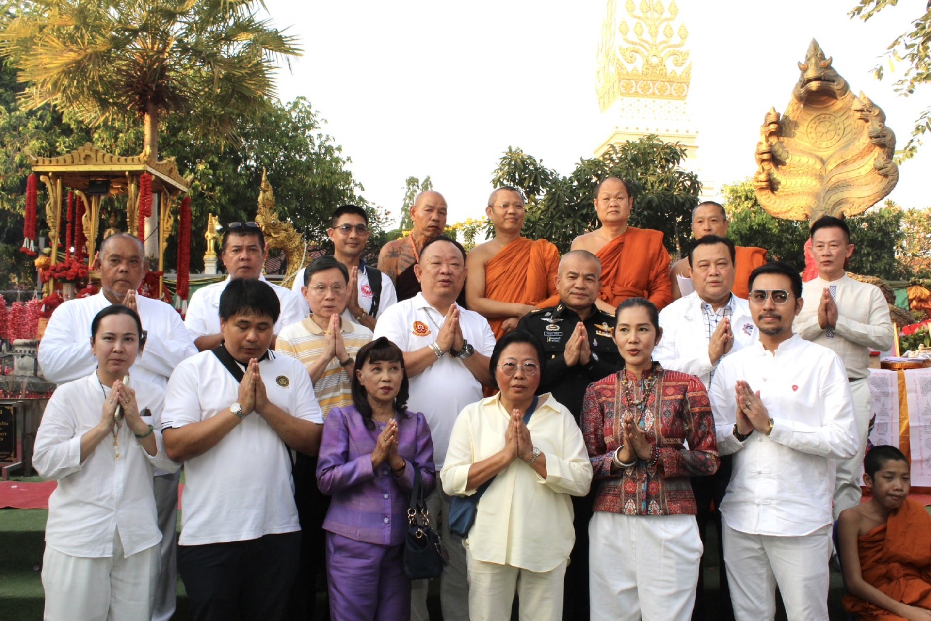 โดยมีพระครูพนมปรีชากร ดร.เลขาฯ เจ้าอาวาสวัดพระธาตุพนม วรมหาวิหาร ผู้ช่วยเจ้าอาวาสวัดพระธาตุพนมฯ (พระอารามหลวง) เป็นประธานฝ่ายสงฆ์, พร้อมด้วยหลวงปู่บุญหลาย วัดปุดเนียม อำเภอไพรบึง จังหวัดศรีสะเกษ, และพระคุณท่าน เมตตาสนับสนุนกิจกรรมในครั้งนี้ มีท่าน พระมหาสุรศักดิ์ ปจฺจนฺตเสโน ผศ.ดร.รองอธิการบดีฝ่ายกิจการต่างประเทศ มหาจุฬาลงกรณ์ราชวิทยาลัย ผู้ช่วยเจ้าอาวาส วัดราชสิทธาราม ราชวรวิหาร พระอารามหลวงกรุงเทพฯ, คุณแม่กำไล หวังประกอบกุล "สังห์แม่กำไล มหาสังข์", คุณเชาวฤทธิ์ หวังประกอบกุล "สังข์แม่กำไล มหาสังข์", อาจารย์พิมพ์ มหาเสน่ห์ เจ้าแม่สายมู เสริมเสน่ห์ เสริมมงคล พลิกดวงร้ายกลายเป็นดี, นายอนันต์ นิลมานนท์ นายกสมาคมหนังสือพิมพ์ส่วนภูมิภาคแห่งประเทศไทย (สภท.๕๙ปี), นายภากร ยังแจ่ม เลขาธิการสมาคมหนังสือพิมพ์ส่วนภูมิภาคแห่งประเทศไทย และเลขาธิการสมาพันธ์สื่อมวลชนแห่งประเทศไทย, ทีมงานคุณภาพท่าน อ.วันชัย สุพรรณ รายการ "คุยเฟื่องเรื่องพระ " และผู้มีจิตศรัทธาเลื่อมใสในพุทธศาสนา จากประเทศมาเลเซีย เดินทางมาร่วมประกอบพิธีอันเป็นมงคลยิ่งใหญ่ พร้อมมอบเงินขวัญถุงและผ้ายันต์ เพิ่มความเป็นสิริมงคลของ "หลวงพ่อแป๊ะ วัดสว่างอารมณ์" เกจิดังแห่งจังหวัดนครปฐม แจกจ่ายให้กับประชาชนที่มาร่วมงานเพื่อความเป็นสิริมงคลยิ่งๆขึ้นในโอกาสนี้ด้วย และขอขอบคุณสายการบินไทยแอร์เอเชีย ที่อำนวยความสะดวกอย่างดียิ่ง ในการเดินทาง ดอนเมือง-นครพนมทั้งขาไปและขากลับ