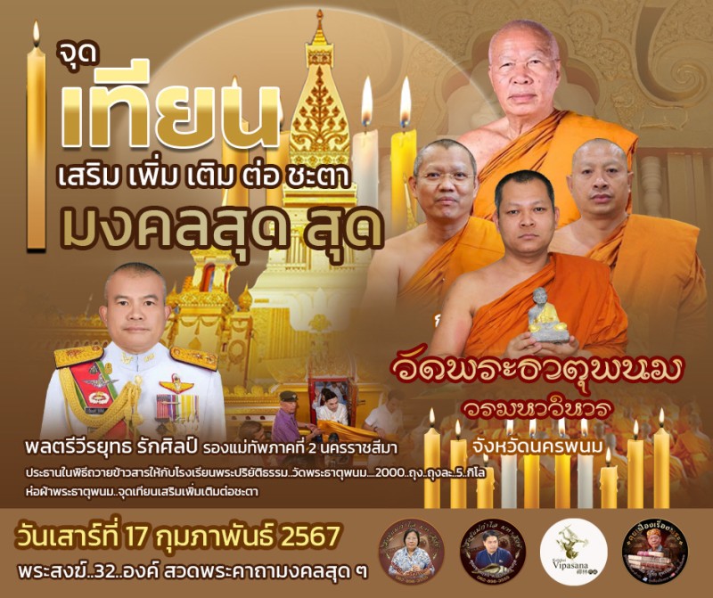 วันที่ ๑๗ กุมภาพันธ์ ๒๕๖๗ เวลา ๑๗.๐๐ น. ณ ลานมณฑลพิธี วัดพระธาตุพนม วรมหาวิหาร (พระอารามหลวง) อำเภอธาตุพนม จังหวัดนครพนม