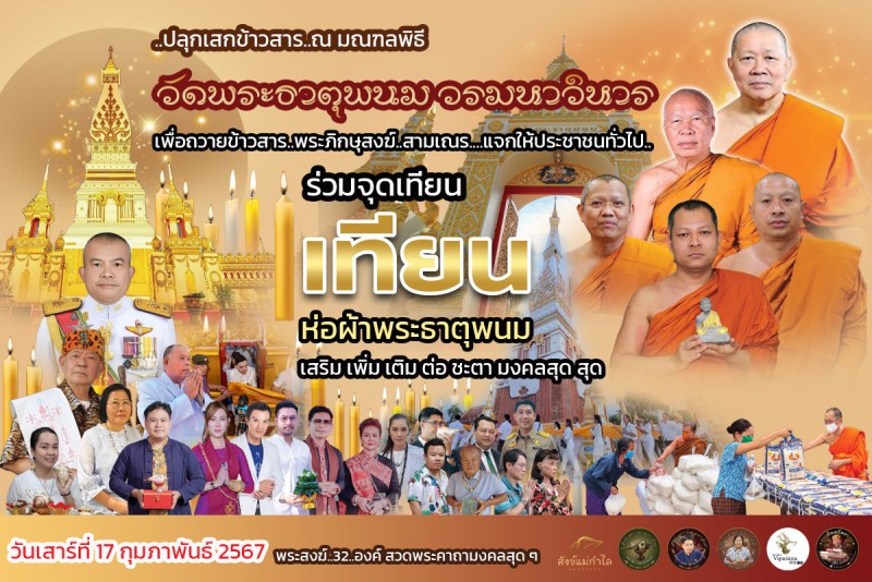 ยิ่งใหญ่สมคำร่ำลือ! พิธีจุดเทียน เสริม เพิ่ม เติม ต่อ ชะตา มงคลสุดๆ ห่มพระธาตุ ปลุกเสกข้าวสาร ณ มณฑลพิธี "วัดพระธาตุพนม วรมหาวิหาร" เพื่อถวายข้าวสาร แด่พระภิกษุสงฆ์ สามเณร และแจกให้กับประชาชนทั่วไป